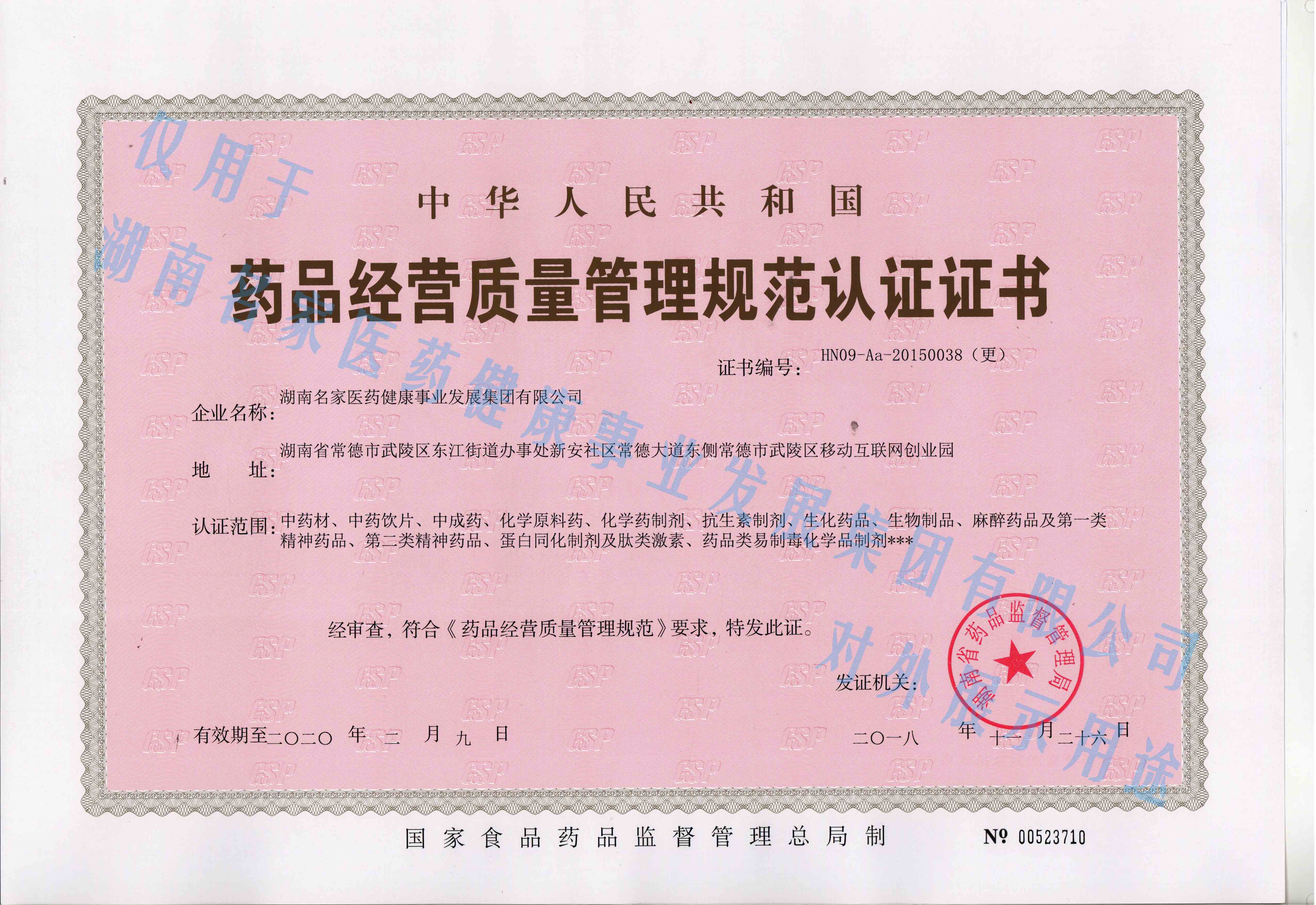 名家医药GSP认证证书